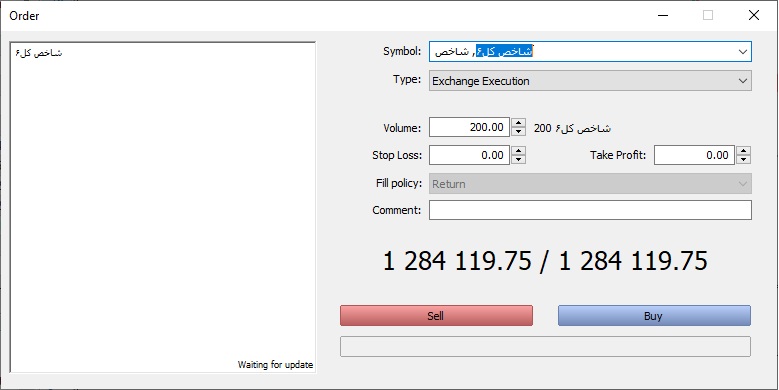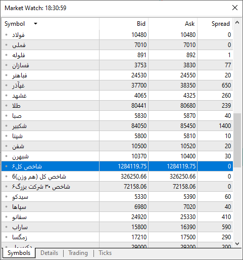 سپس در مرحله دوم با دوبار کلیک بر روی نام مورد نظر در پنجره باز شده نام کامل دارایی را انتخاب می کنیم برای مثال نام کامل شاخص کل که در مفید تریدر به صورت (شاخص کل6, شاخص) می باشد.
